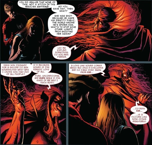 Quello che più ha deluso i lettori è l’idea alla base. La Marvel ha volutamente rifiutato una sfida verso una nuova maturità narrativa per ripiegarsi sul già detto, con l’obiettivo di accontentare i lettori puntando sulla loro nostalgia. E nel farlo non solo ha cancellato tappe importanti nello sviluppo del personaggio di Peter Parker, ma ne ha anche forzato la natura. Per quanto devoto alla sua zia, Peter non avrebbe mai accettato la proposta di Mefisto. Negli anni ha imparato che la morte è parte naturale della vita, e non sacrificherebbe mai il suo futuro (un futuro con chi ama) per la vita di qualcuno che, in fin dei conti, ha fatto il suo tempo e non gli chiederebbe mai una scelta del genere.