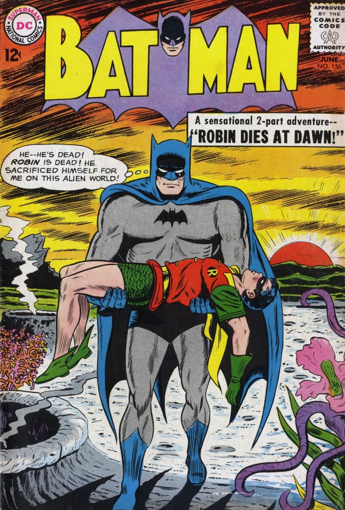 In conseguenza, le storie degli anni Cinquanta e Sessanta si caratterizzano per trame particolarmente eccentriche. Mentre alcune sono finite presto e giustamente nel dimenticatoio (come “Batman e il Mostro Arcobaleno”, in cui Batman e Robin affrontano un mostro degli stessi colori dell’arcobaleno e che per ogni colore aveva un potere diverso), altre storie hanno invece ancora il pregio di approfondire aspetti della psiche del personaggio e giocare con intuizioni abbastanza apprezzabili. Si pensi alla storia Robin morirà all’alba (Batman 156, 1963). L’albo si apre con un Batman errabondo sulla scabra superficie di un pianeta roccioso: dovrà affrontare mostri temibili e piante aliene per salvare Robin. Ma proprio quando tutto sembra perduto e la sua spalla è a un passo dalla morte, la storia cambia prospettiva. Siamo in realtà in una camera di osservazione blindata: dalla finestrella sulla porta, Robin e un dottore osservano preoccupati il Cavaliere Oscuro, e interrompono quella che si scopre essere solo una simulazione. A un Batman frastornato i due ricordano che era stato così coraggioso da offrirsi volontario per simulare gli effetti della solitudine sulle menti e sui corpi degli astronauti: Batman era rimasto infatti da solo per giorni in quella stanza, mentre i medici monitoravano i suoi parametri vitali. Nel resto della trama, il Crociato Incappucciato torna alla sua lotta al crimine, ma l’esperimento ha ormai lasciato una vera e propria nevrosi nel Cavaliere Oscuro, che nel mondo reale è colto da improvvisi attacchi di panico: sarà proprio grazie a Robin che Batman tornerà padrone di sé.