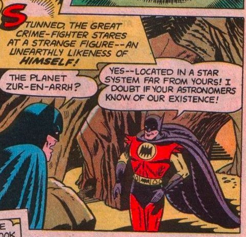 Un’altra storia che si lascia apprezzare è quella del Batman di Zur-En-Arrh (Batman 113, 1958). Durante un volo sul suo Batwing, Batman riceve una richiesta di soccorso e, avendo deciso di accettare, si ritrova magicamente catapultato su un altro pianeta: Zur-EnArrh, appunto. Qui incontra un uomo con uno strano costume di Batman rosso, giallo e viola. Questo Crociato Incappucciato varipinto gli rivela di essere il Batman di quel pianeta: adesso però ha bisogno dei poteri di Bruce per fronteggiare i cattivi. Sul pianeta Zurr-En-Arh infatti Bruce Wayne possiede la superforza e la capacità di volare: proprio grazie a questi poteri riesce ad aiutare la sua versione aliena, e a ritornare a casa una volta compiuta la missione.