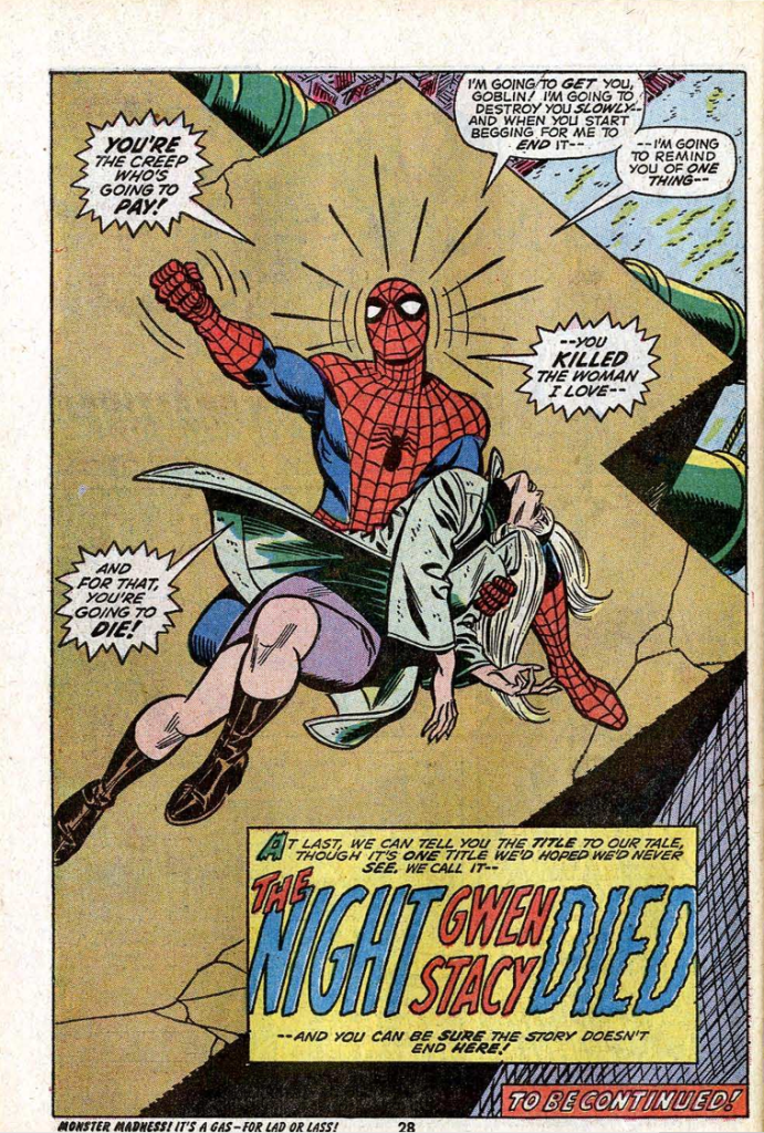 Quando si parla di questa decade in relazione al fumetto supereroistico, infatti, tutti sono concordi nel riconoscere un periodo di profonda maturazione: che è ancora più drastica se si pensa all’atmosfera degli anni precedenti. Forse, l’evento simbolo di questa maturazione – una vera e propria perdita dell’innocenza – è Amazing Spiderman 121, del 1973. In questo albo cade la persona più innocente che le pagine dei comics conoscessero: Gwen Stacy, la giovanissima, prima e indimenticabile fiamma di Peter Parker.